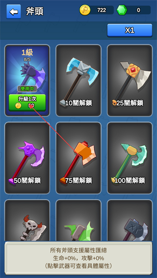 2、进入斧头界面后,找到当前使用中的1级斧头,点击升級1次按钮,消耗金币提升斧头等级,以便增强后续挑战的战力。