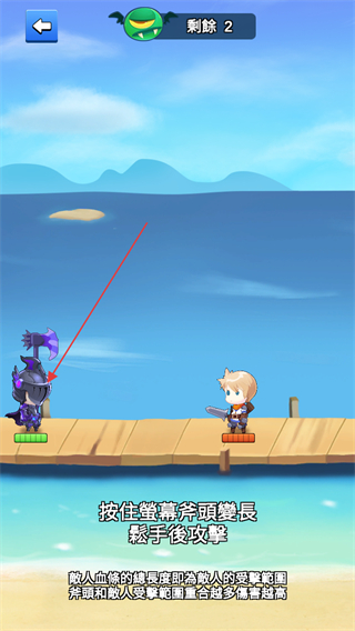 3、在战斗环节,按照提示长按角色进行攻击操作,尽量让斧頭与敌人站位重合来提高伤害。