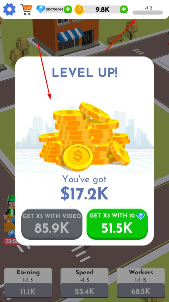 3、当升级到一定程度时,会触发LEVEL UP!,获得大量金币奖励;还能通过观看视频或消耗钻石,获取多倍金币奖励,助力游戏快速发展。