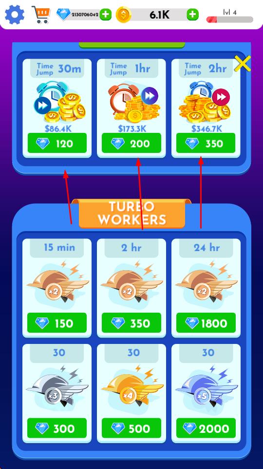4、在对应界面中,可消耗钻石进行Time Jump来获取金币,也可使用钻石解锁或升级TURBO WORKERS相关道具,提升工人效率,加速游戏进程。