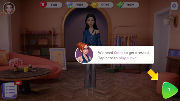 1、进入游戏后,点击绿色按钮进入关卡,通过消除关卡获取金币等资源,用于时尚装扮。
