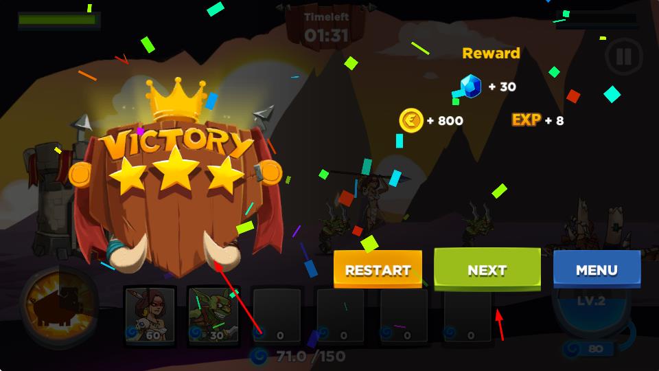 4、成功击败敌方目标后,可获得胜利,赢得金币、宝石等奖励,之后可选择进入下一关继续挑战。