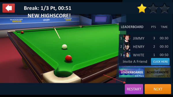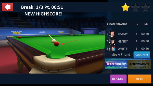 1、真实物理模拟:采用高精度物理引擎计算球体轨迹,完美还原台球碰撞与滚动效果,玩家需精确调整击球角度与力度,感受真实的斯诺克运动。
