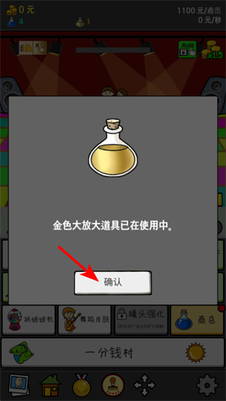 3、当弹出金色大放大道具已在使用中提示时,点击确认按钮可关闭提示框,继续进行游戏操作,确保游戏流程顺畅。