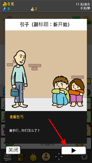 1、在游戏引子界面,点击下方播放按钮,可推进剧情,开启老板乞丐的游戏故事线,这是进入游戏内容的关键操作。