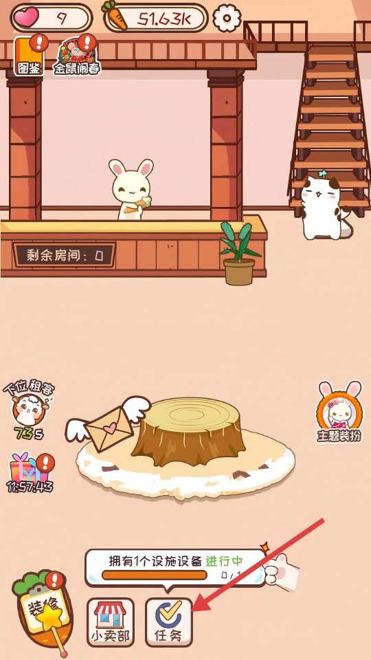 2、在游戏中,点击下方任务按钮,查看“拥有1个设施设备”的任务,依据提示获取对应设施设备。