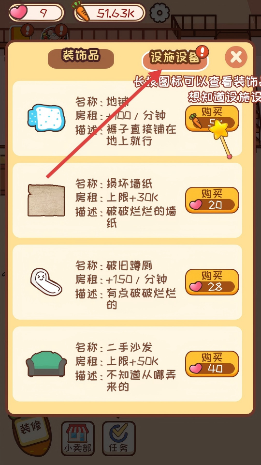 3、进入设施设备界面,可见地铺、损坏墙纸等各类设施,可消耗胡萝卜、爱心等资源购买,提升房间设施档次。