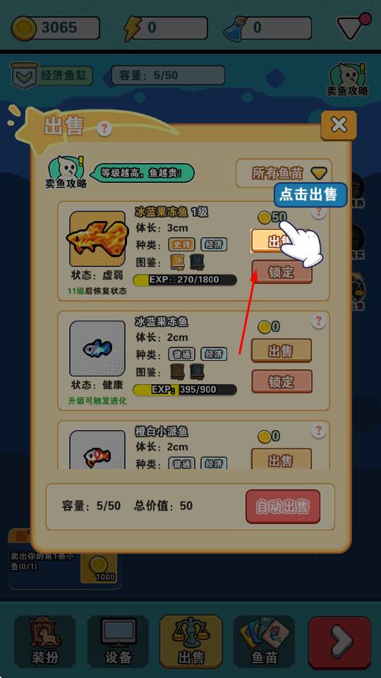 3、当鱼成长到一定阶段,可进入出售界面,将鱼出售获取金币,等级越高的鱼售价越贵。