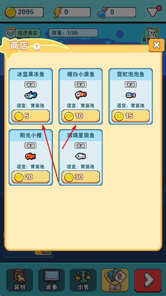 1、在商店中,可使用金币购买不同种类的鱼苗,如冰蓝果冻鱼、橙白小派鱼等。