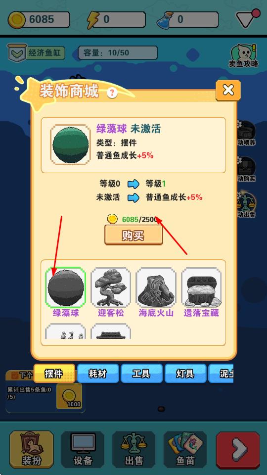 4、利用出售鱼获得的金币,可在装饰商城购买摆件,这些摆件能对鱼的成长起到增益作用。