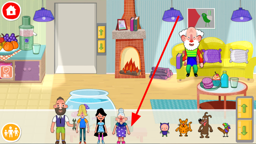 4、拿起桌上的水果,递到老奶奶嘴边,和老奶奶进行分享水果的互动,营造温馨的生活场景氛围,让生活模拟更具趣味性。