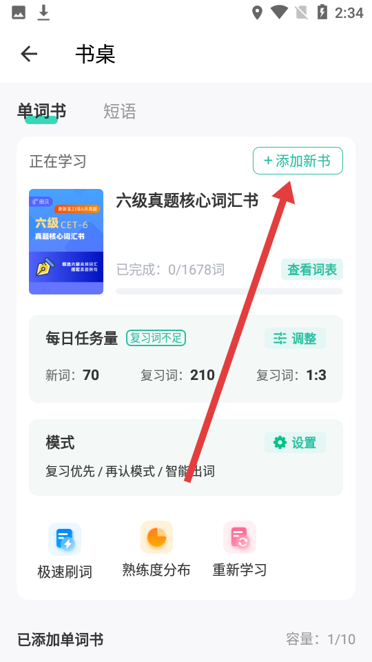 2、进入书桌页面的单词书区域,点击添加新书按钮,进入新书页面。