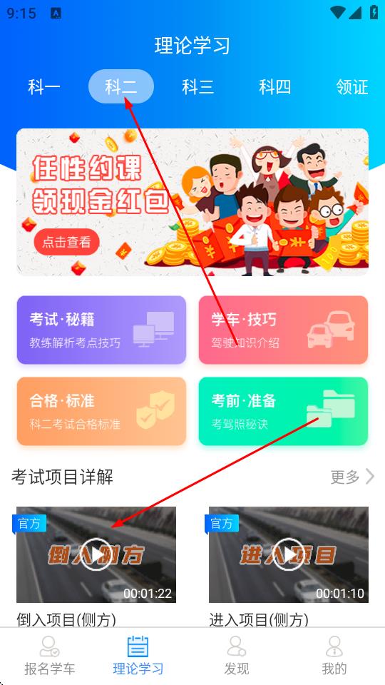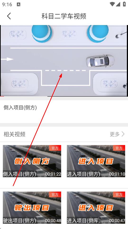 3、在科目二学习界面的考试项目详解板块下,选择想要观看的视频教程,如点击倒入项目。