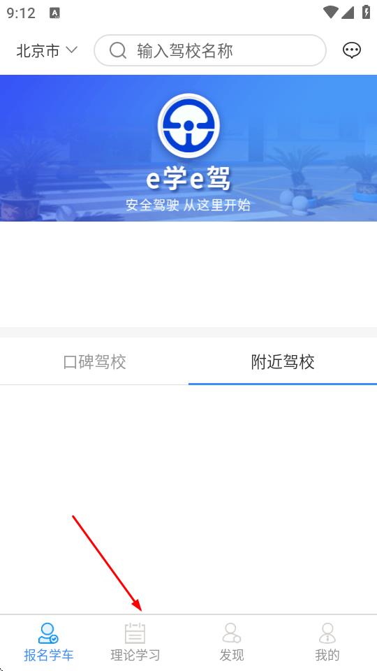 1、打开e学e驾APP,进入主界面,点击底部导航栏中的理论学习选项。