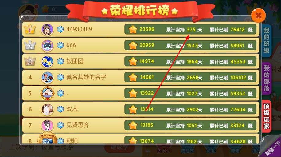 2、进入荣耀排行榜页面后,在自己的信息板块中,能看到累计坚持天数。