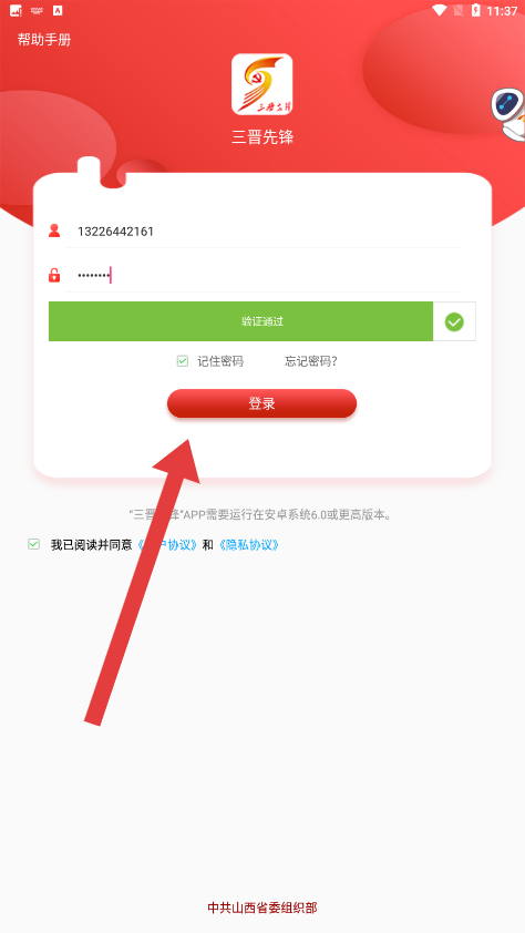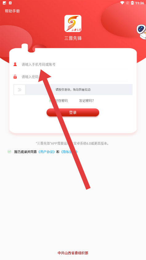 1、在三晋先锋登录页面中,点击输入框输入手机号进行登录操作。