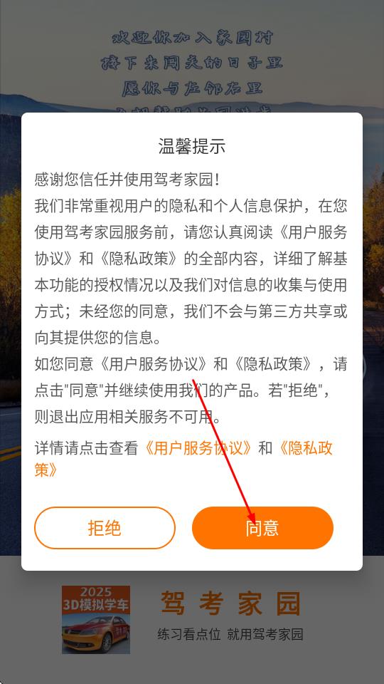 1、打开驾考家园APP,在弹出的温馨提示页面,点击同意。