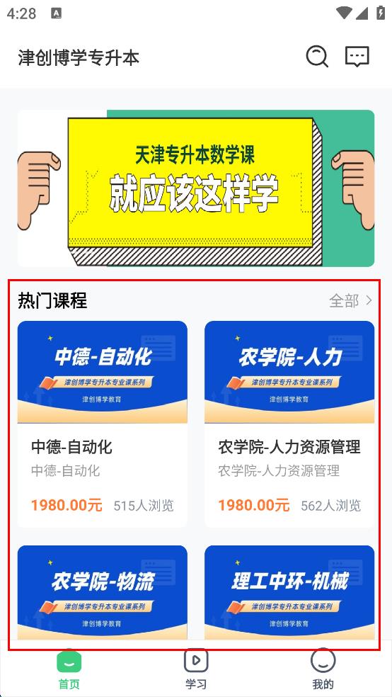 4、进入所选网校界面,比如“津创博学专升本”界面,界面有热门课程板块,展示了“中德-自动化”“农学院-人力”等课程,可查看课程价格、浏览人数等信息。
