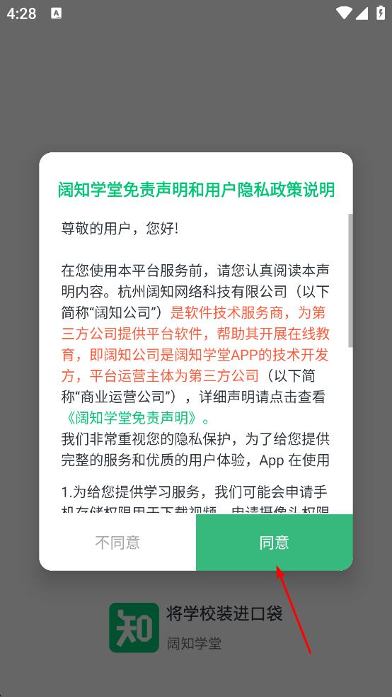 1、打开阔知学堂,进入免责声明和用户隐私政策说明界面,界面说明杭州阔知网络科技有限公司是技术服务商,平台运营主体为第三方公司,重视隐私保护,点击“同意”按钮。