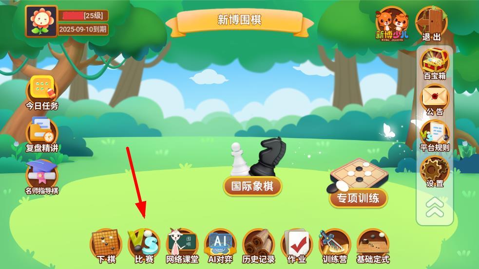 1、打开新博少儿对弈平台app,进入主界面,点击下方导航栏中的比赛图标,进入比赛中心页面。