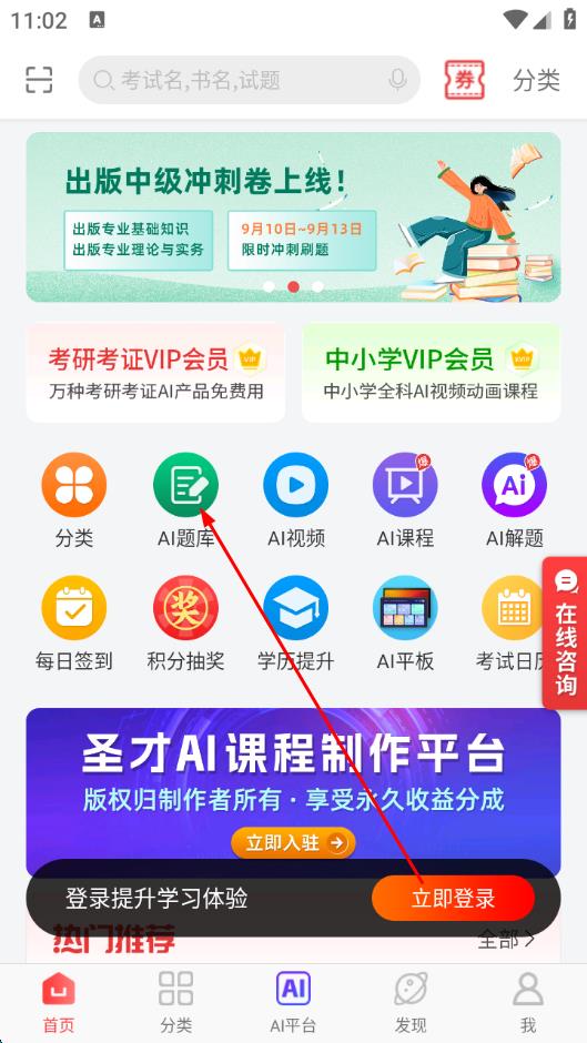 1、打开圣才电子书APP,进入首页后,在界面中找到并点击AI题库选项,进入题库选择页面。