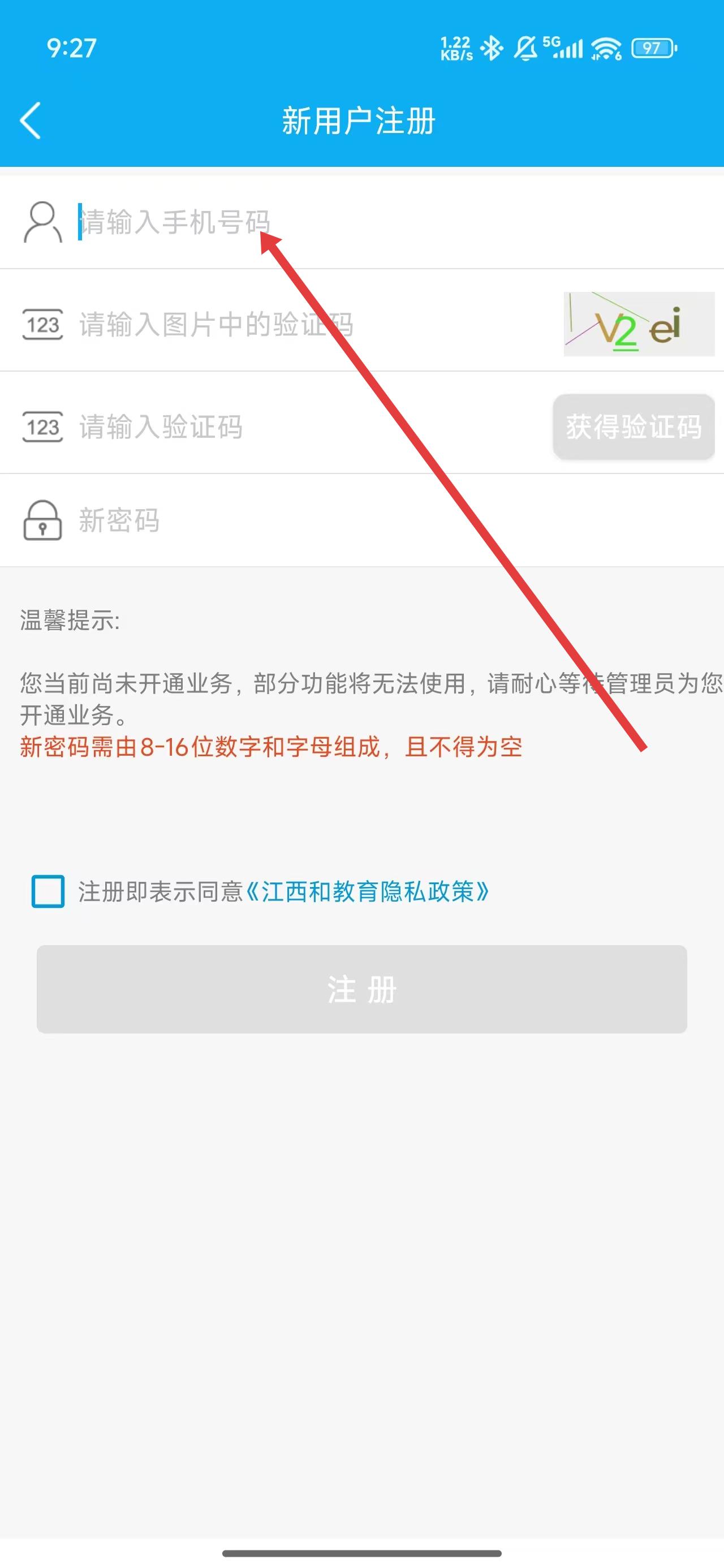 3、在新用户注册页面中,点击输入框输入手机号等信息完成注册操作。