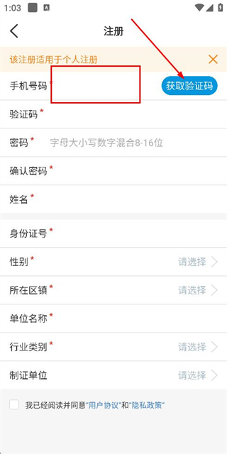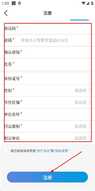 3、在注册页面完善所有必填信息并勾选协议后,点击底部的注册按钮完成个人注册操作。