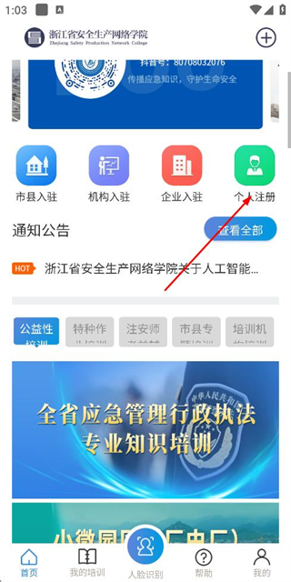 1、在浙江省安全生产网络学院首页点击个人注册选项,进入个人注册信息填写页面。
