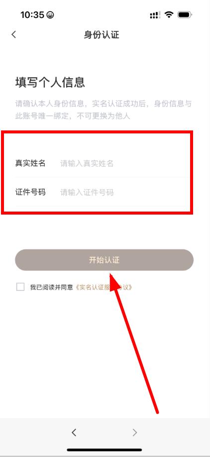 4、在填写个人信息界面,输入真实姓名和证件号码,勾选同意相关协议后,点击开始认证,按照后续提示完成实名认证。