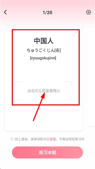 4、在单词学习界面,点击单词卡片可查看释义,进行背单词。