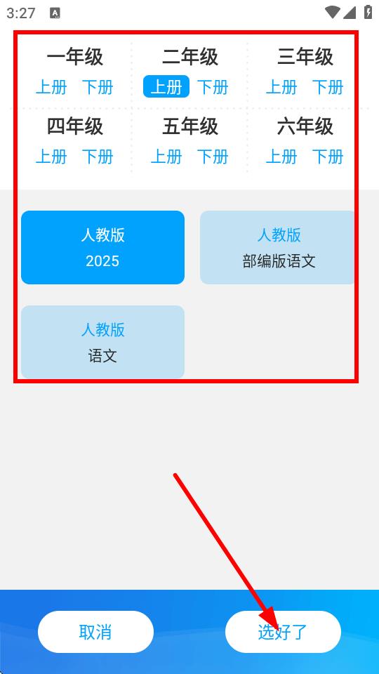 3、在选课本界面,选择对应的年级、上下册以及教材版本,选好后点击选好了。