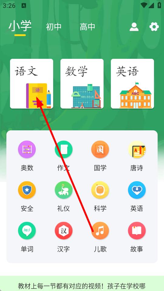 1、打开小飞机语文应用,在主界面选择小学学段,点击语文图标。