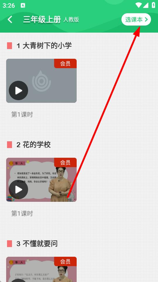 2、进入语文学习页面后,点击右上角选课本按钮。