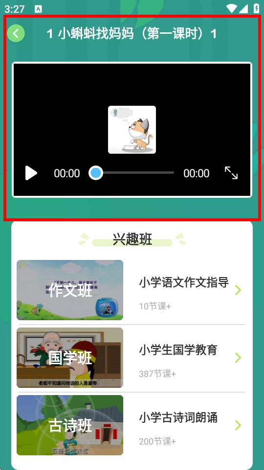 4、返回语文学习页面,点击想要学习的课文,即可观看对应课时的视频课程,还能在下方选择如作文班、国学班等兴趣班进行拓展学习。