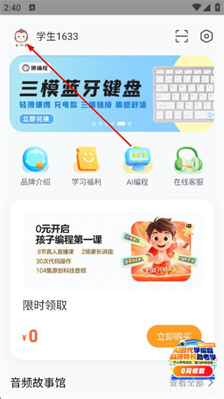 1、打开猿编程,点击左上角的头像区域,进入编辑资料页面。