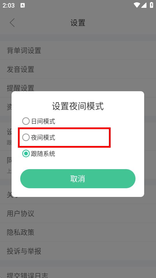 4、在弹出的设置夜间模式窗口中,选择夜间模式选项即可成功开启夜间模式。