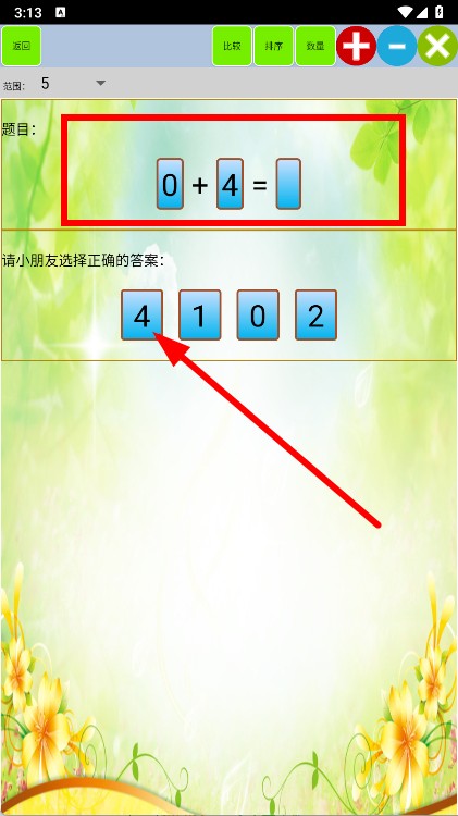 2、进入算术题目页面,出现加法题目,下方有多个答案选项,选择正确的答案。