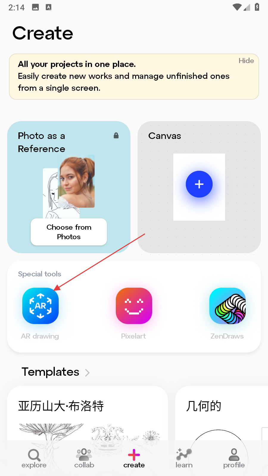 1、打开素描画图AR大师应用,在Create页面中,点击Special tools区域内的AR drawing选项,进入AR绘图相关界面。