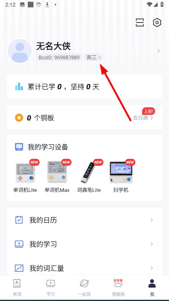 2、在个人页面中,点击自己的账号区域旁边的年级按钮,点击进入年级修改界面。