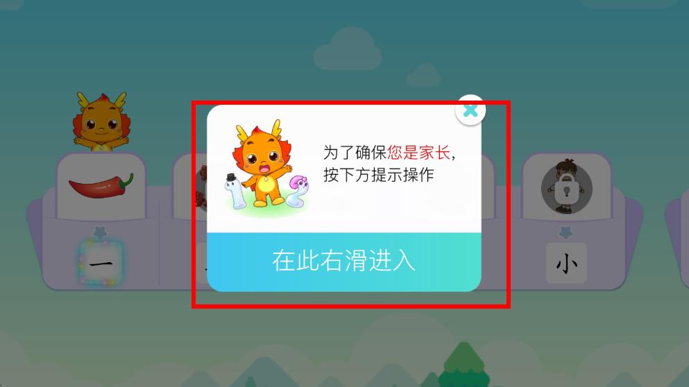 2、点击父母中心后,会弹出验证窗口,按照提示在此右滑进入,完成家长身份验证。