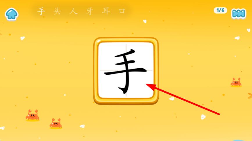 3、进入具体的识字页面后,会展示要学习的汉字,比如手字,按照页面引导完成认读、书写等学习任务。