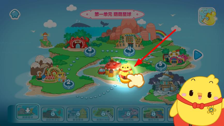 2、进入学习单元页面,如第一单元萌萌星球,跟随指引点击相应的学习关卡,像图中被点亮指引的位置。