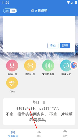 1、在彝文翻译通首页,点击底部的学习选项,进入学彝语页面。
