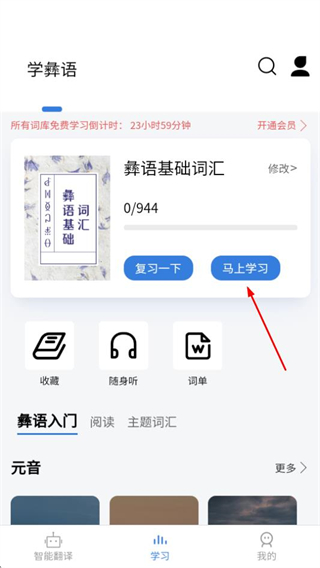 2、在学彝语页面,点击彝语基础词汇板块的马上学习按钮,进入学习页面。