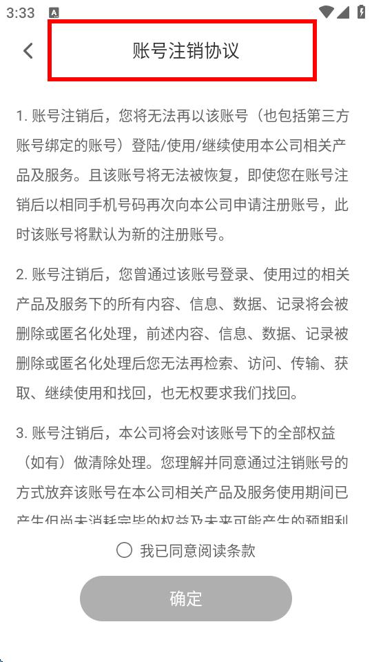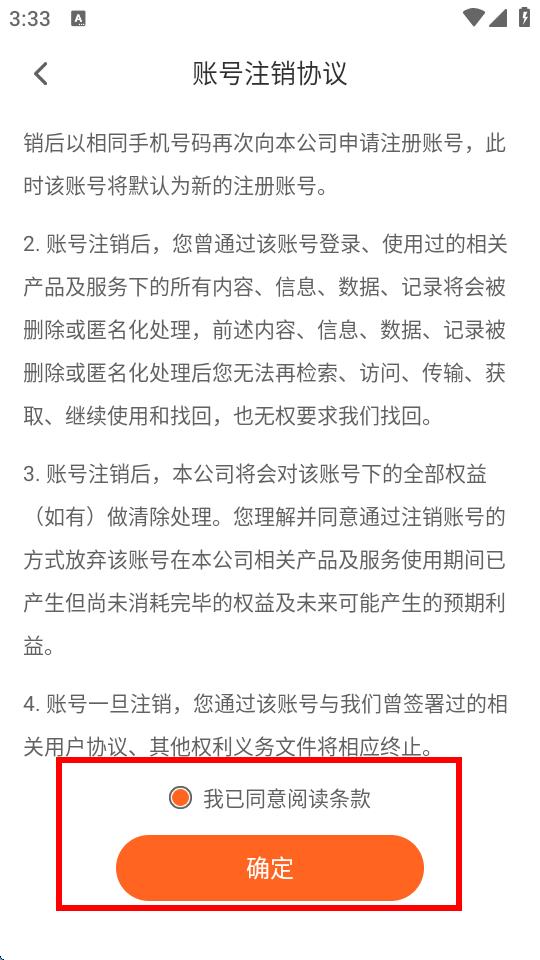 4、阅读完毕后,勾选我已同意阅读条款,再点击确定按钮,即可按照提示流程完成账号注销。
