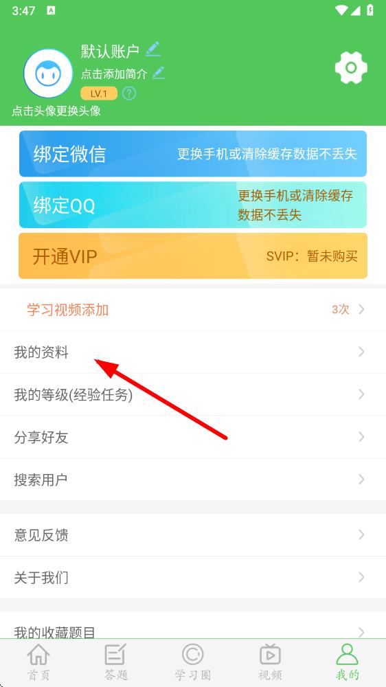 2、在我的页面中,点击我的资料选项,进入用户信息页面。