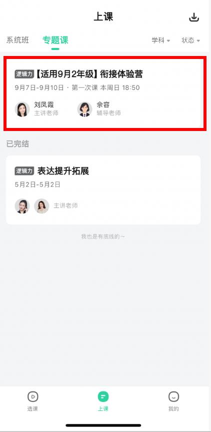 2、在上课页面中,切换至专题课或系统班选项卡,如查找逻辑力适用9月2年级衔接体验营课程。