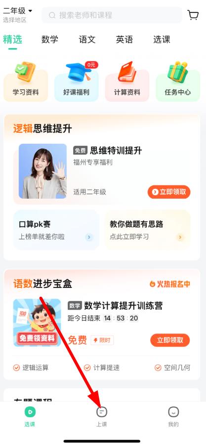 1、打开作业帮APP,进入选课界面,点击底部导航栏中上课按钮进入上课页面。