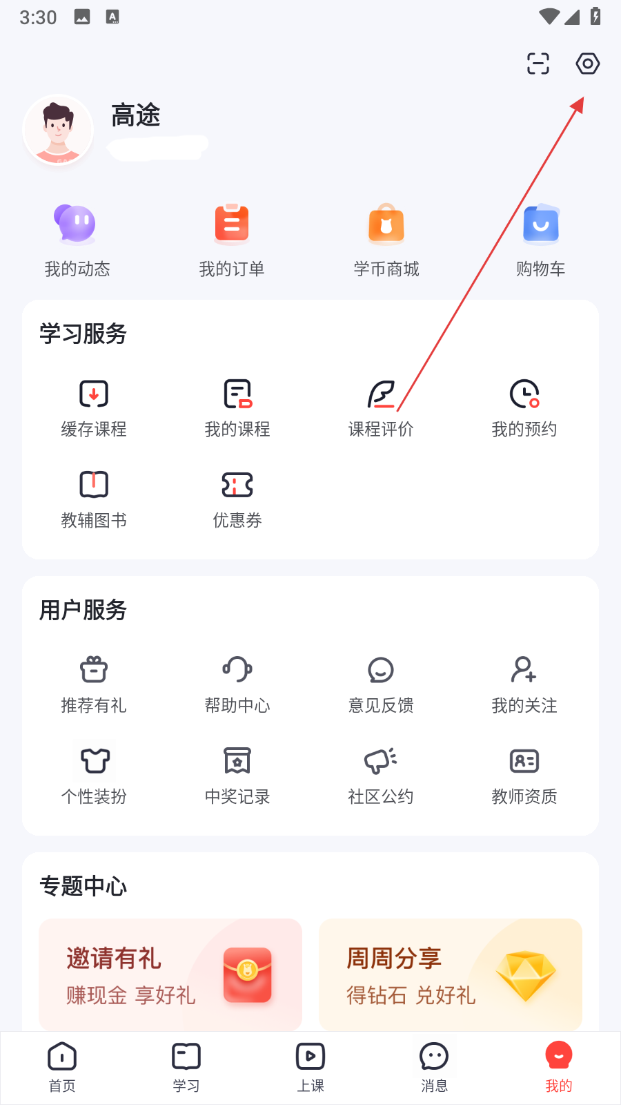1、打开高途APP,进入个人页面,在页面右上角找到设置图标并点击。