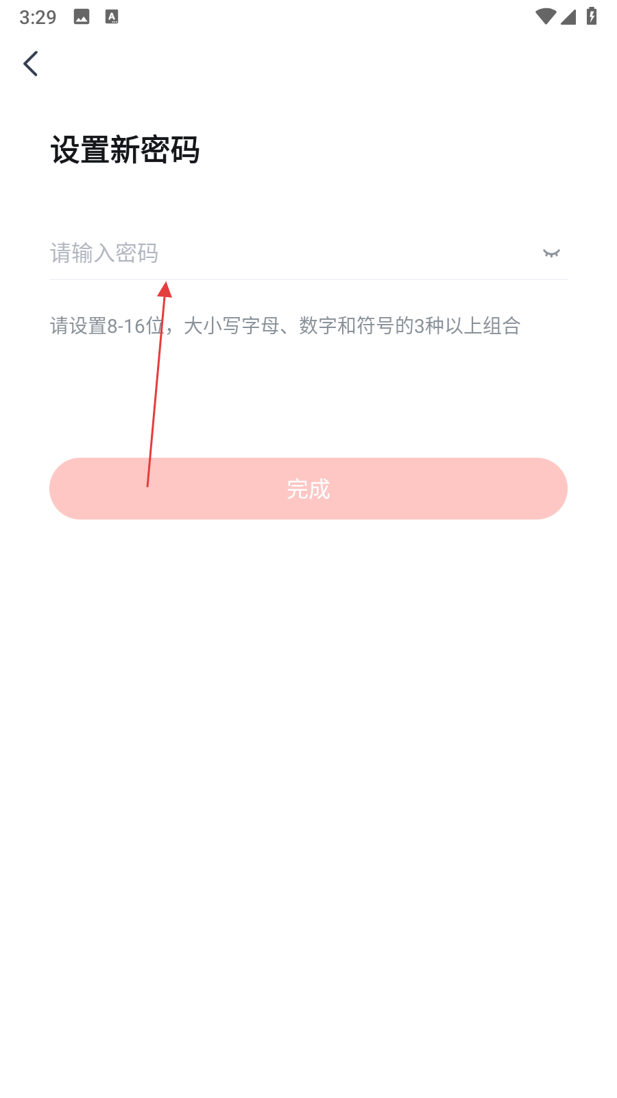 4、在设置新密码页面的输入框中,输入符合规则的密码,输入完成后点击完成按钮。